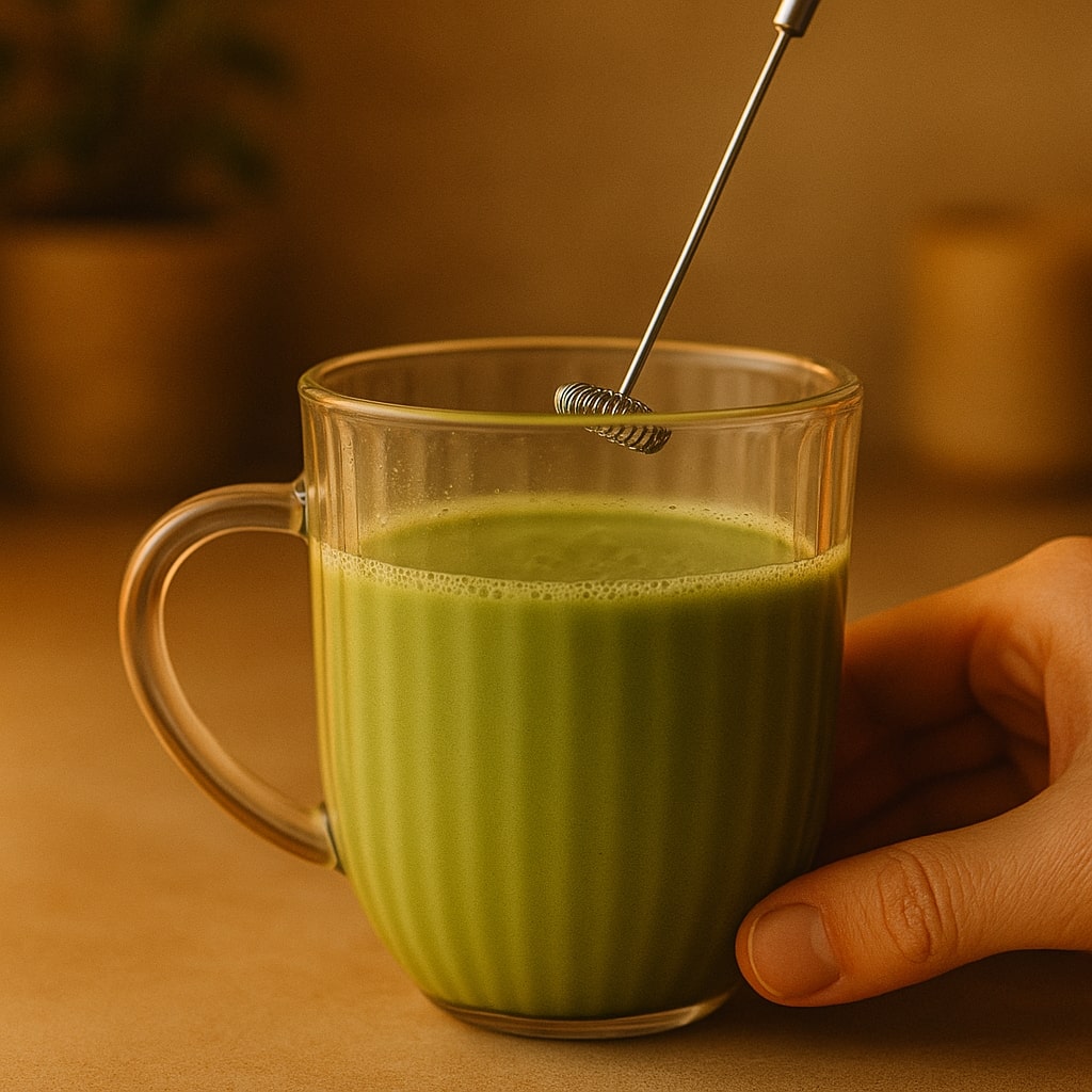 Rajoutez votre Latcha ! Dosez à votre convenance. On vous recommande une belle cuillère à café pour 150ml de lait.